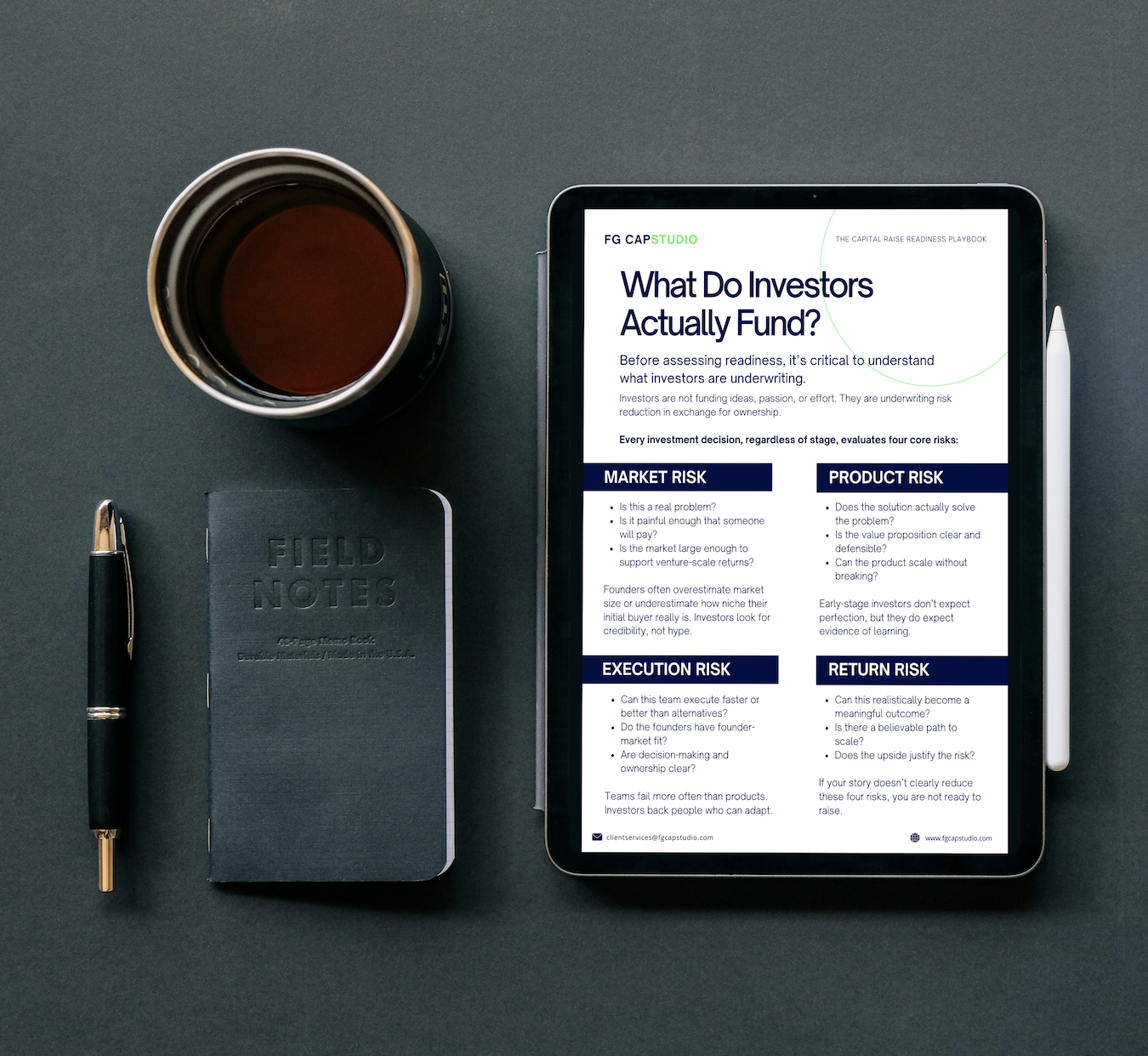 FG Cap Studio is built for founders preparing to raise capital. We professionalize your materials and systemize your process, impressing investors from the first interaction.